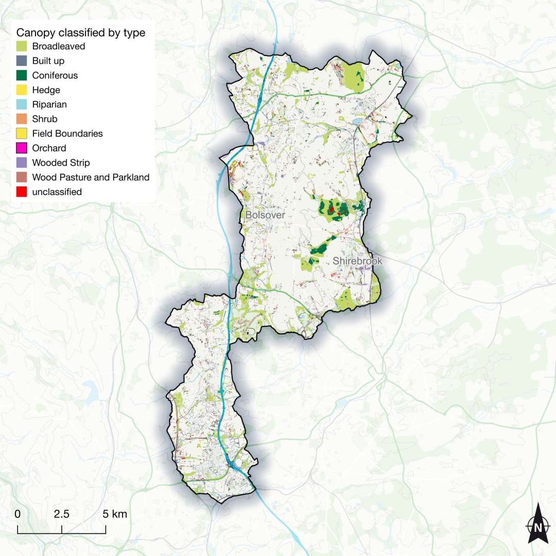 A canopy cover study was carried out by Treeconomics using Google Environmental Explorer (refer to Appendix 5.2) which found Bolsover currently has almost 2,800 hectares of tree canopy cover, covering 17.5% of the district. There is a large variation across the wards, with the lowest canopy cover found in Bolsover East ward, and the highest in Langwith ward.