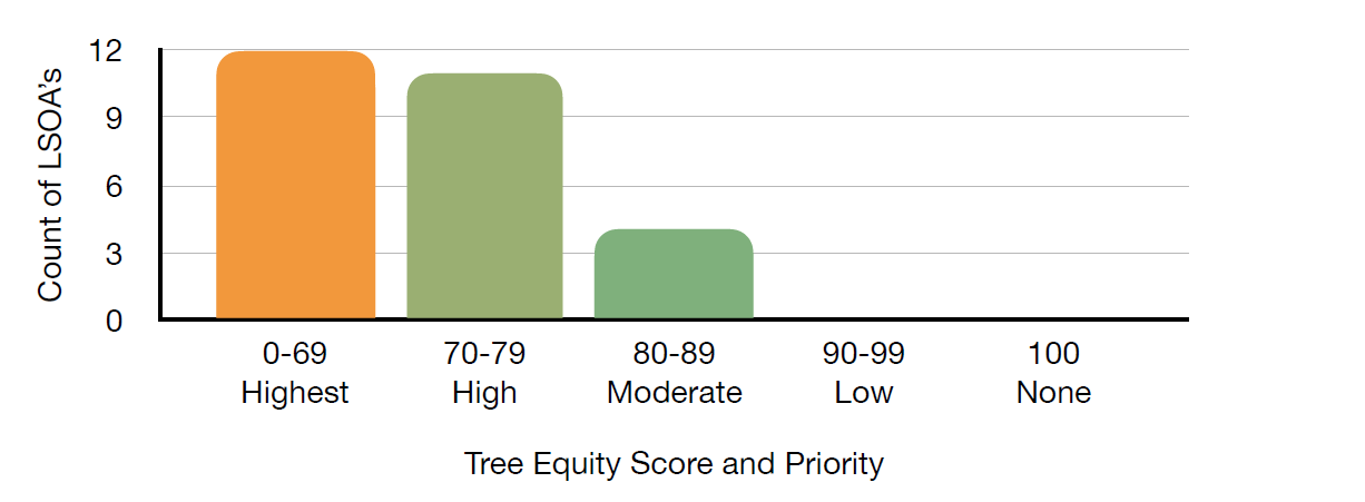 The Woodland Trust have created a Tree Equity Score map of the UK, which ranks Lower Super Output Areas (LSOA's) with an index based on canopy cover, Index of Multiple Deprivation (IMD), air pollution, heat disparity, and at-risk age category (figure 4)